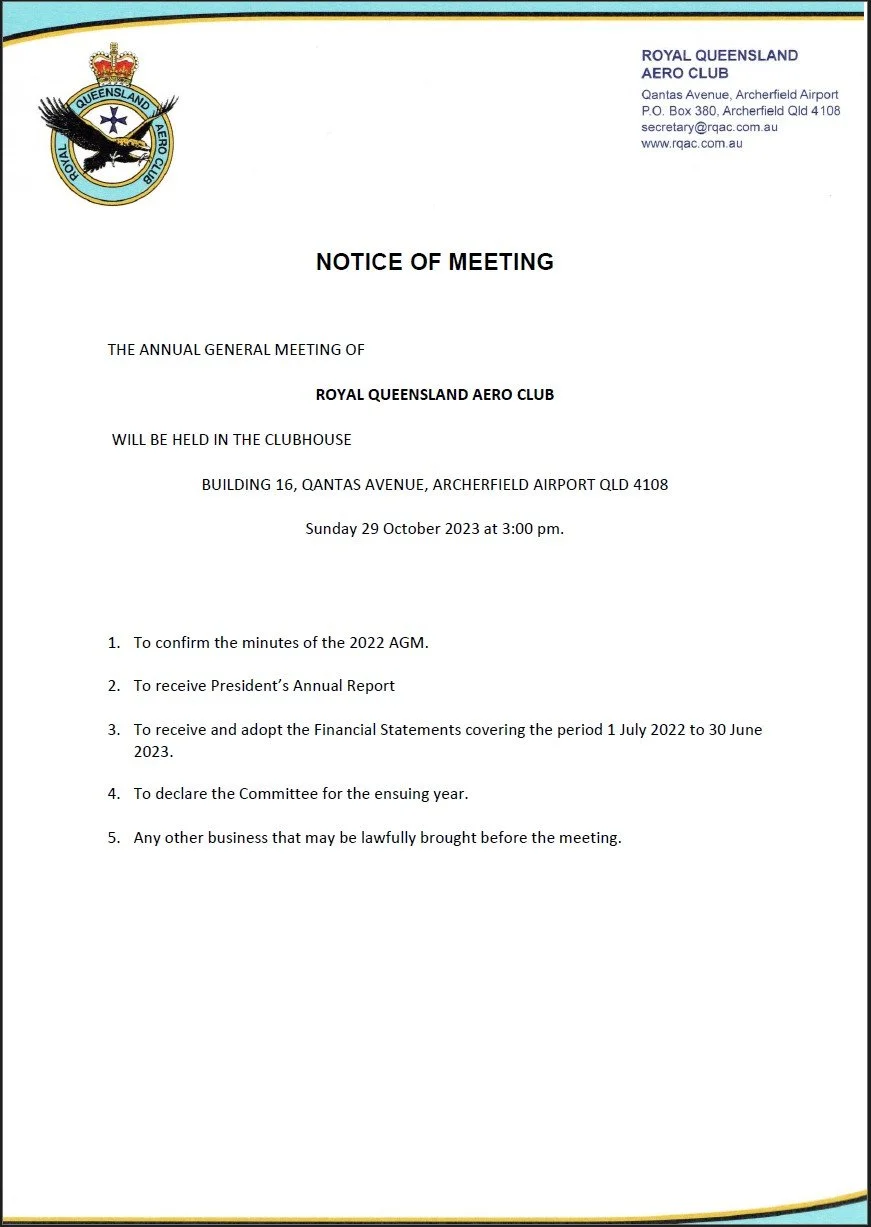 RQAC AGM 2022-23 Sunday 29 October 2023 3:00 pm 5:00 pm RQAC 16 Grenier Drive Archerfield, QLD, 4108 Australia (map) Google Calendar ICS